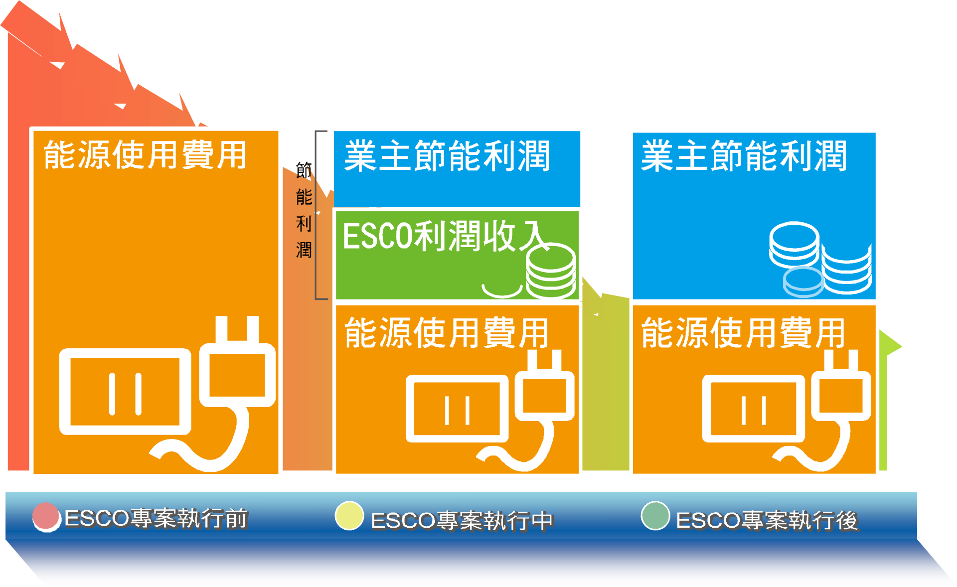 透過節約能源之自償性,以節省之能源費用分期攤提專案工程費用,有省錢才付費!